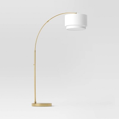 Threshold knurled metal arc floor lamp with tiered shade in brass